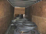 What happens when you combine 20 tons of loose steel in a box van (instead of a flatbed) and a ditzy Atlanta driver with a cellphone to her ear who just passed on the right, then cut in front and laid on the brakes. Yep, some of those 500 lb rings are touching the tractor gangway. | ||||||||||||||||||