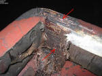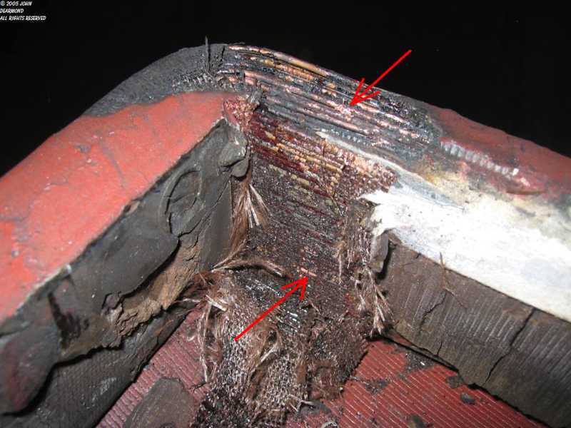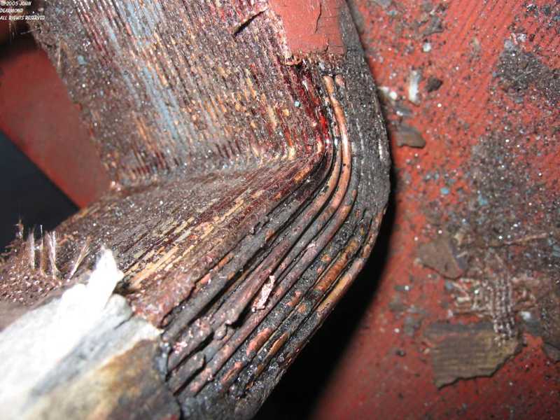| This photo shows a couple of failure points in the shunt field. The arrows show the failure points. The inner surface (lower arrow) was directly against the pole piece. Not a great design for a 600 volt coil. Note the voids in the potting. |