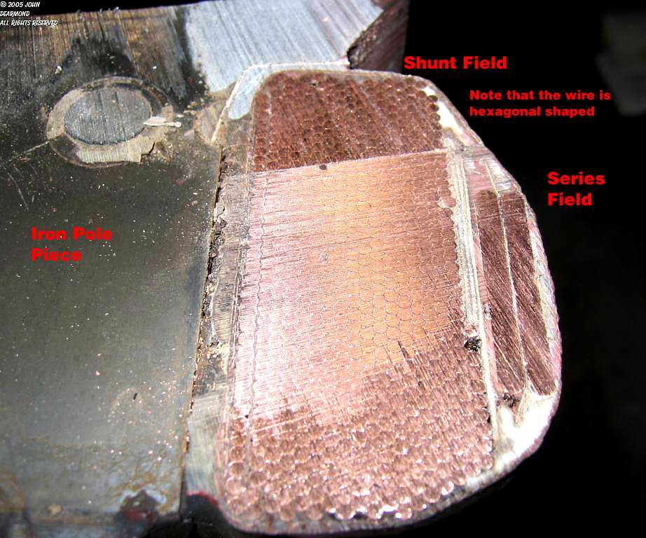 | A cross-section of the pole. The various parts are identified. Several features are of interest. First is the hexagonal cross-section of the shunt windings. Second is the small number of series turns. Note that the shunt field runs on 600 volts. |