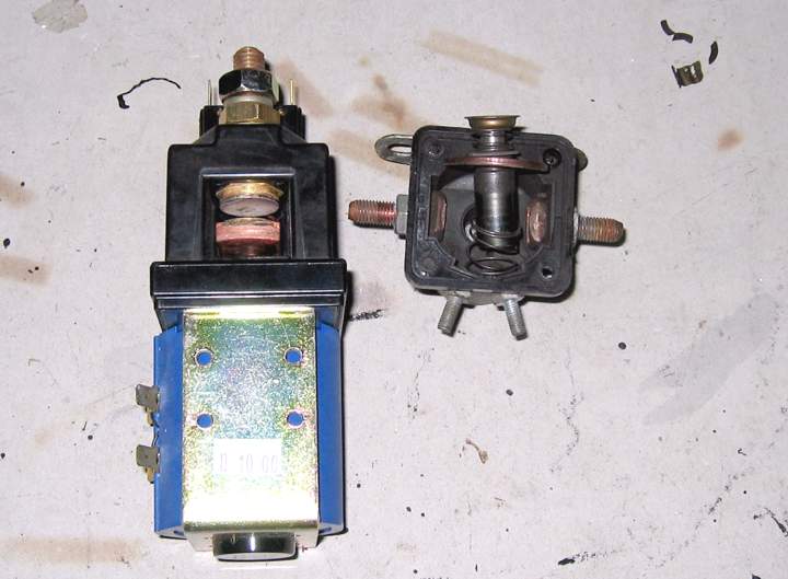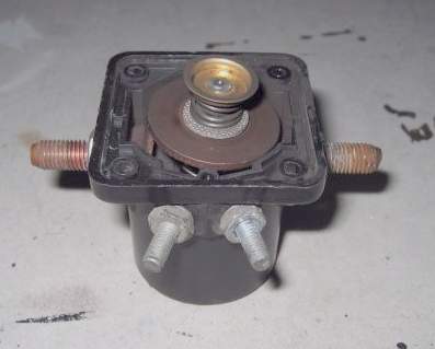 This is the solenoid with the plunger and contact ring removed. When the solenoid is energized, the plunger pulls down a copper ring that makes contact with the stud on each side. Not very robust. | |||||||