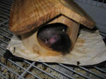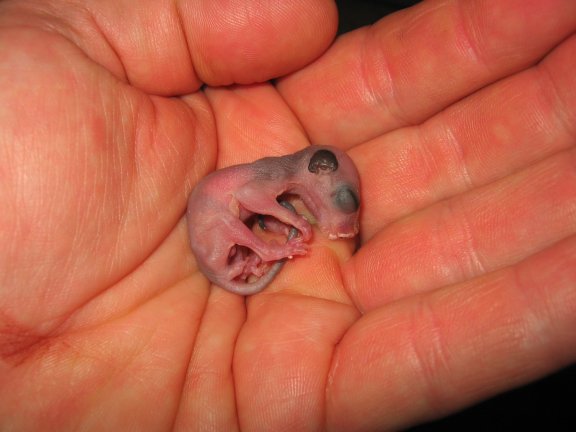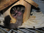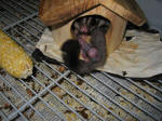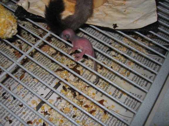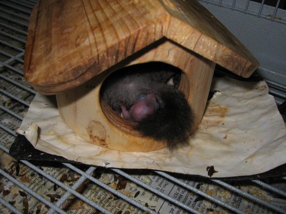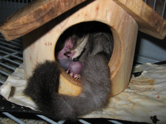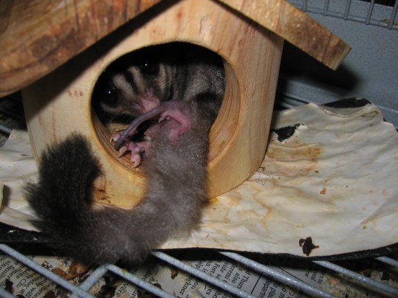 02/06/06: Joy and her beau Jake have had their first baby. Unfortunately as of this date, the baby isn't doing well. I first heard a new noise from the cage late this afternoon. I thought it was Joy goofing off. Tonight when I returned, the sound was much quieter. I looked in her hutch and saw the baby, out of the pouch, hairless and very weak. I watched over the next couple of hours to see if the baby would go back in the pouch. No such luck. Joy licks the baby but doesn't seem to do anything to help it along. I tried to feed it a bit of puppy formula that I'd used on a baby coon but it is too weak to take it. It's 1:00 am now and I'm afraid I've lost the baby. I haven't heard any sounds for half an hour now. I'm not going to disturb Joy anymore tonight. We'll see what happens in the AM. Some photos: |