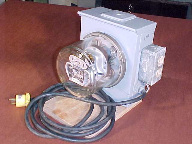 This photo shows the connection for 120vac operation. The astute will note that I'm metering both the hot and neutral leads. This nifty little trick allows me to use a 2 pole 240 volt meter (the most ubiquitous type) on 120 vac. The potential coil sees only half voltage but the current coils deliver two signals, one for the current going out and the other coming in. The two neatly compensate each other. I've verified this equivalence on my meter calibration bench. | ||||||||