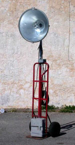 the brightest light I'd ever see. Time passed, my eyes got older and the wattage got higher. The light featured here is the current state of my art. This light features a 1000 watt Metal-Halide lamp, a telescoping mast that reaches about 25 feet, 50 feet of cord and two convenience outlets. A light this bright has several advantages. One can illuminate an entire room, even a large one, with one lamp. One can shine the light onto the ground beneath a car and the reflected light is bright enough to work under the car without additional lighting. One can illuminate a whole parking lot. The light can be telescoped up high enough to mostly keep the summer bugs above the work area. The pictured light is the first one I built about 7 years ago. Since then it has become popular. I have built several of these for contractors and even a public safety department. I have developed several standard versions: