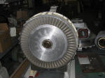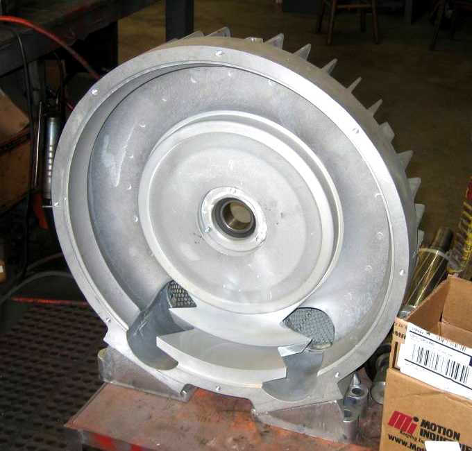 Electric Motor Service. I took some photos along the way. Caution: Regenerative blowers operate with very tight tolerances. The rotor runs at a very high velocity. Ergo, the unit tolerates very little abuse. If you decide to disassemble your blower, do not beat or pry on the housing if you expect the rotor to not drag afterward. Even a tiny opening in rotor-diffuser clearance will cause a dramatic decrease in performance. The most common repair is damage caused by bearings wearing out. The rotor-diffuser clearance is so tight that a bearing does not have to fail catastrophically to cause rotor-diffuser contact. Even slight scuffing of the diffuser face, damage to the rotor blades or warpage of the rotor will dramatically reduce the unit's performance. Therefore do not wait until the bearings fail completely. Take the unit out of service and replace the bearings at the first sound of roughness. Jerry's has the special tools that make taking the machine apart easy and