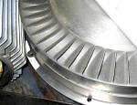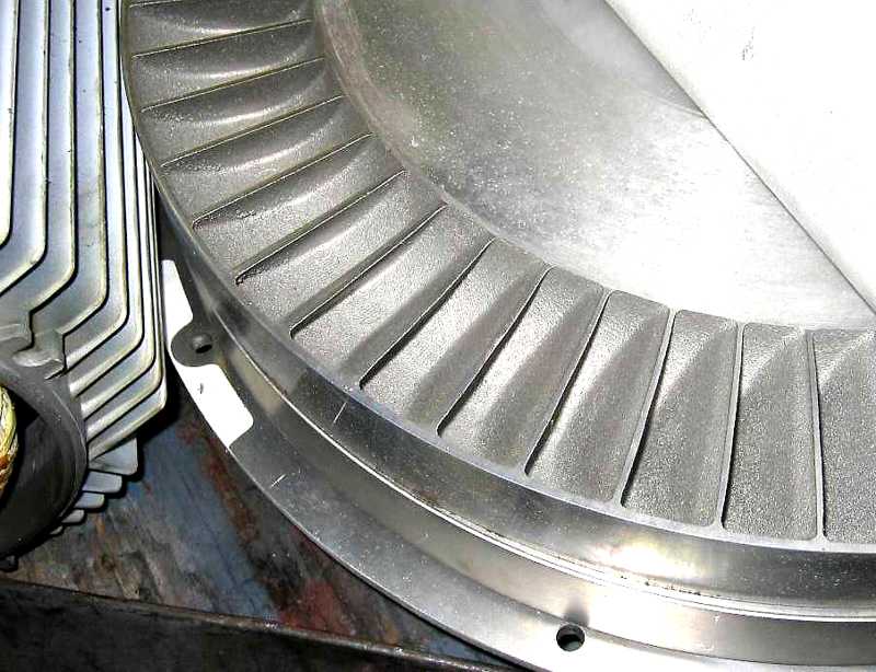 | The diffuser housing. The air enters one port, travels around the periphery where the rotor imparts velocity and then exits the other diffuser port, converting velocity to pressure. Caution: The shapes are very important. Do not try to improve the blower performance by changing the shape of the ports |