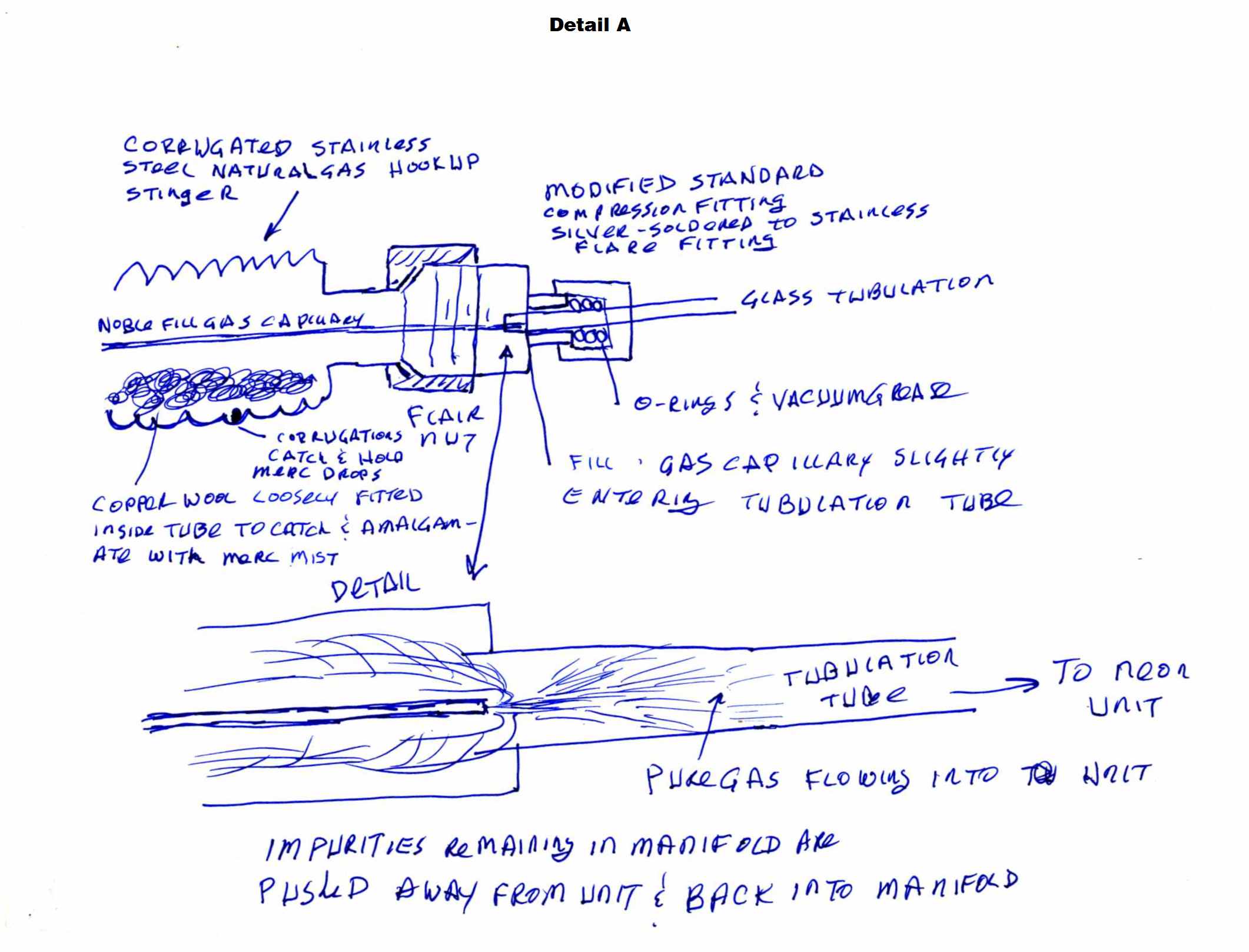 I use capillary tubing for several reasons. One, the small internal volume wastes a bare minimum of expensive noble gas. Second, and more importantly, it permits my unique high purity fill setup. Refer to Detail A above again, you'll notice that the capillary tubing enters the vacuum system through the manifold end of the stinger. It extends the entire length of the stinger and into the adapter. To understand why this is so beneficial, let's consider a conventional manifold.