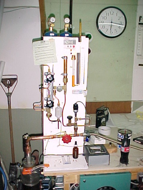 You can see several features. Starting at the top are the two 20 liter disposable tanks of noble gas from Spectra Gas. These guys are a dream to deal with, will sell to individuals, accept plastic and are about half the price of "neon suppliers". The tanks, which look like propane tanks, come with a CGA-580 connector but I removed that big bulky thing and connected directly to the instrument valve on the tank. Actually I use these 20 liter tanks as my "day tanks" and refill them when empty from 200 liter tanks, also purchased from Spectra. The gas is cheaper that way. More importantly, if I make a mistake like opening a gas cock into the vacuum system, I only waste 20 liters or less instead of a large 200 liter tank. Don't laugh, it happens. This is a close-up of the tank assembly. The tanks come equipped with those nice instrumentation needle valves, the 90 deg elbow and a female CGA-580 fitting. I drilled and tapped the elbows for the little pressure gauges. Since that photo was taken, I replaced all the teflon tape downstream of the needle valve with epoxy. The brass compression fitting has to be loosened to refill the tanks so I coat the ferrules with silicone vacuum grease instead of epoxy. Proceeding down the photo, on the right is the closed end manometer. This type of manometer is VASTLY superior to U-tube manometers in that no valve is involved, it is impossible to suck the fluid out and minor zeroing is accomplished by sliding the scale. The system as pictured is under full vacuum and the gauge is zeroed. It is designed to use common DC-704 silicone diffusion pump oil.