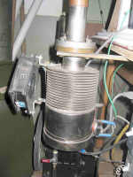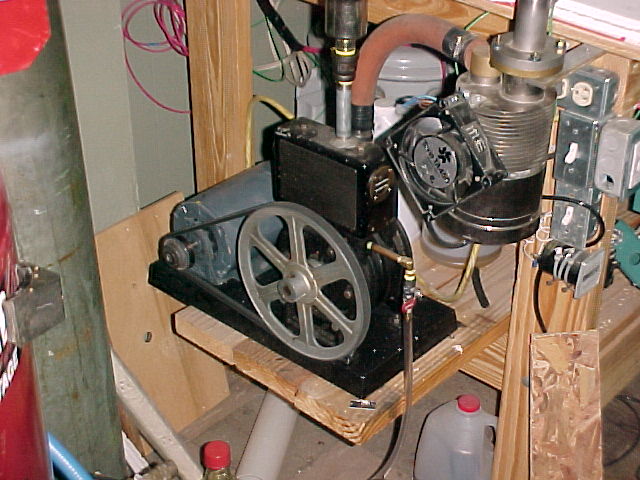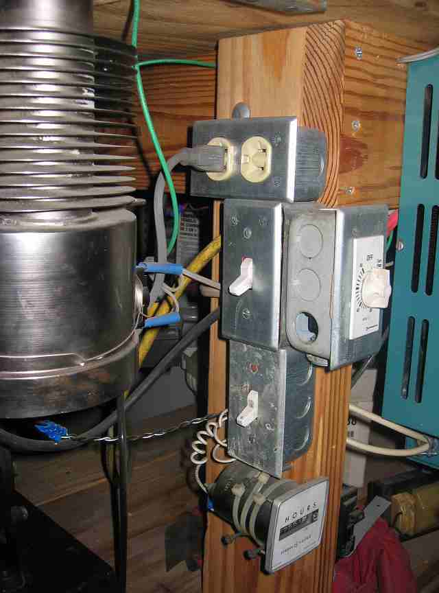 I found that if I turned the muffin fan on with the heater power, it cooled the whole pump enough to delay its start by over an hour. Therefore I added the switch. It turns the fan on when the boiler reaches about 200 deg F and turns it off at about 195. You can also see how I support the pump by its inlet flange. This takes any undue stress off the pump itself and is the method Varian recommends.