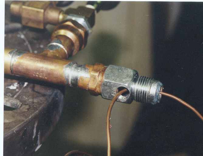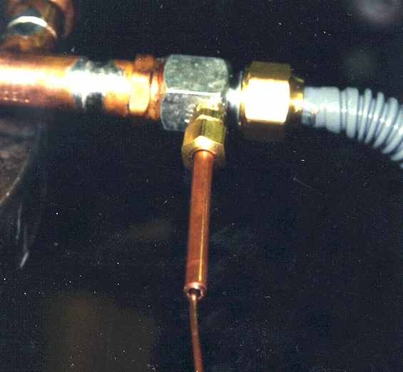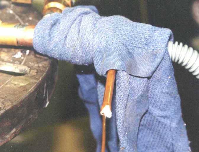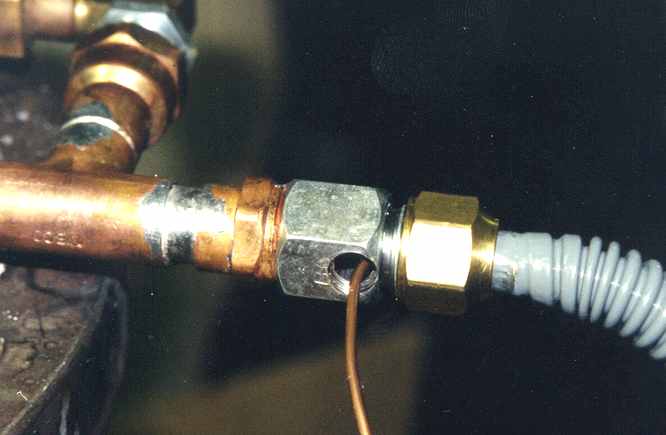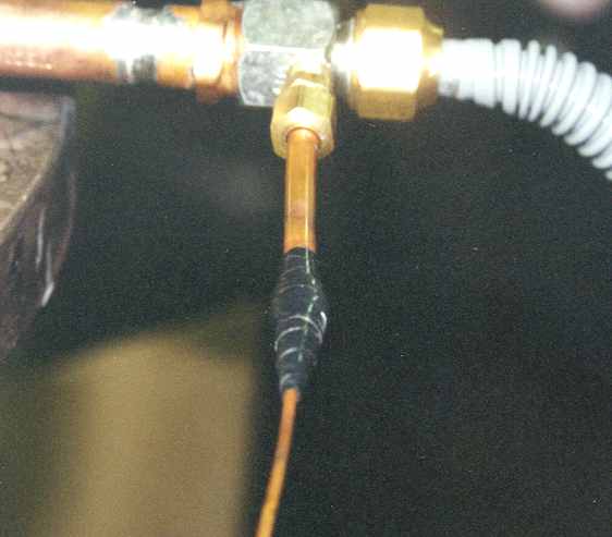 In this photo the joint has cooled and the junction between the capillary tubing and the larger tubing has been wrapped with electrical tape that serves as a strain relief. The capillary tubing will work-harden and break after only a couple of flexures at the silver-soldered joint.