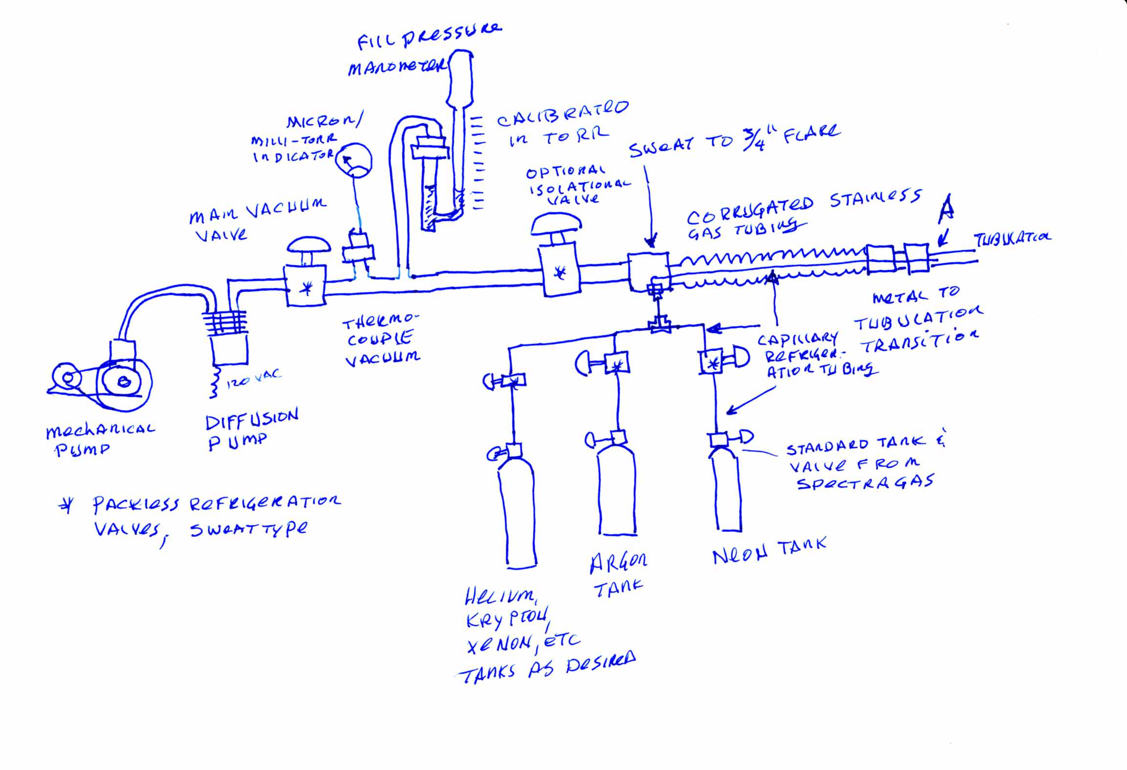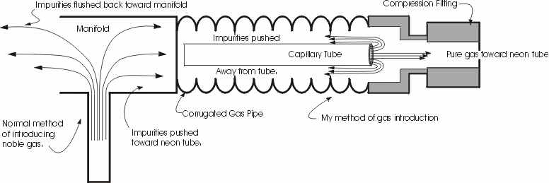 Connected to that valve is a length of ordinary natural gas flex hose, commonly called a "Stinger" or "whip". Usually made of stainless steel, this is run from the rigid gas supply to, say, a water heater or furnace. A common size is a 3/4" with a flare fitting on each end. The stinger is usually supplied with a pair of 3/4" flare to 3/4" NPT adapters. The reason for this stinger is so that the vacuum connection can be moved to the neon unit and not vice-versa. At the other end of the stinger is a custom-made adapter that goes from 3/4" flare to an O-ring compression fitting that the tubulation tubing is inserted into. This illustration shows the fitting in more detail. The o-ring compression fitting is made from an ordinary 1/4" NPT male to 1/4" copper compression fitting adapter. The brass compression ferrule is discarded and the top of the fitting where the ferrule mated is filed flat and de-burred. Two or three Viton O-rings are place where the brass ferrule used to go. If necessary, the hole in the compression nut and the hole through the fitting is enlarged so that the tubulation tubing will easily slide in. When the nut is tightened, the O-rings form a vacuum-tight grip around the glass. Fill Gas SystemProbably one of the most innovative features of this design is the fill gas system. You'll notice from the illustrations that a "capillary tube" is used to connect the noble gas plumbing. This is ordinary refrigeration capillary tubing, available from any HVAC supply distributor.