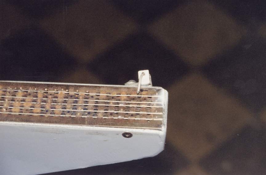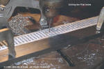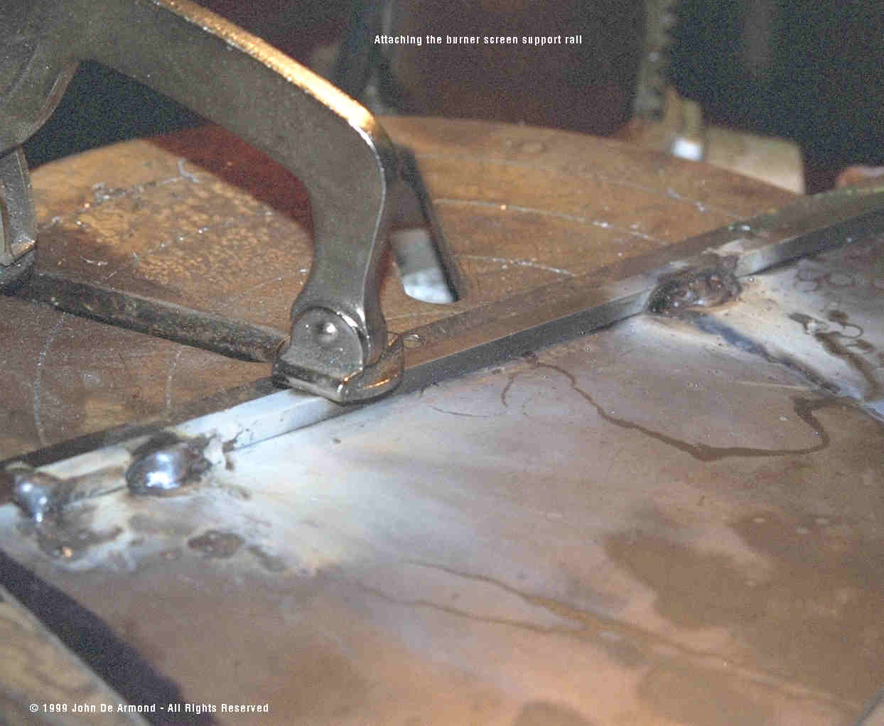 the metal red hot with a torch before bending. The screen shows several features. The velocity of the mixture though the screen holes must exceed the combustion speed or else the flame will back down the hole and cause a flashback. After laying out the screen with the correct size holes I realized that I'd have hundreds of holes to drill. I came up with a clever method of cutting those in half. I drilled larger holes, then cut grooves through the centerline, then placed and staked stainless steel wire. This wire effectively makes two holes out of one, increases the velocity and prevents flashbacks. |