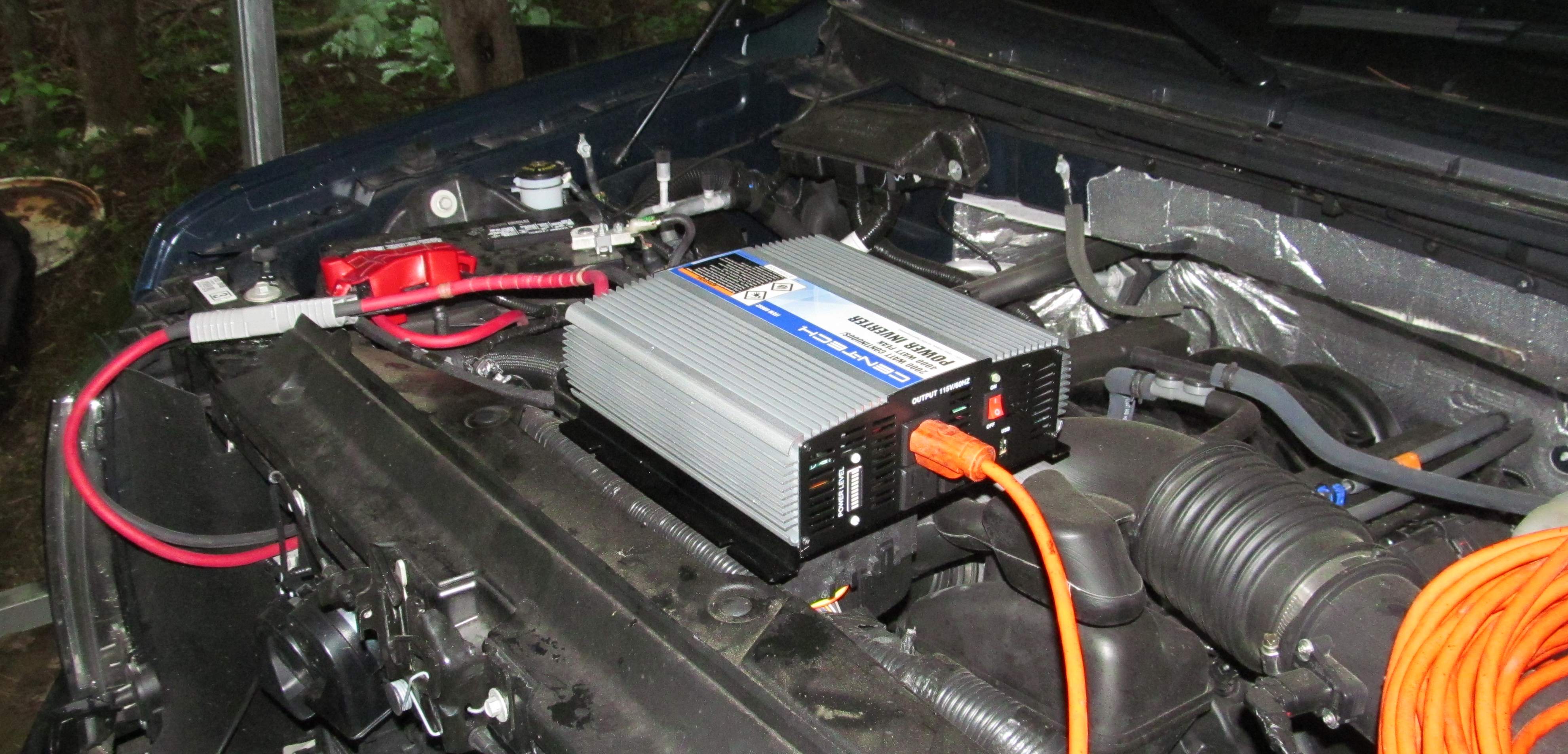 Here's what we're working toward. The cables from the battery to the grey Anderson cables are connected, the leads from the other Anderson connector are connected to the inverter and a 100 ft extension cord is plugged into the inverter. | ||||||||||||