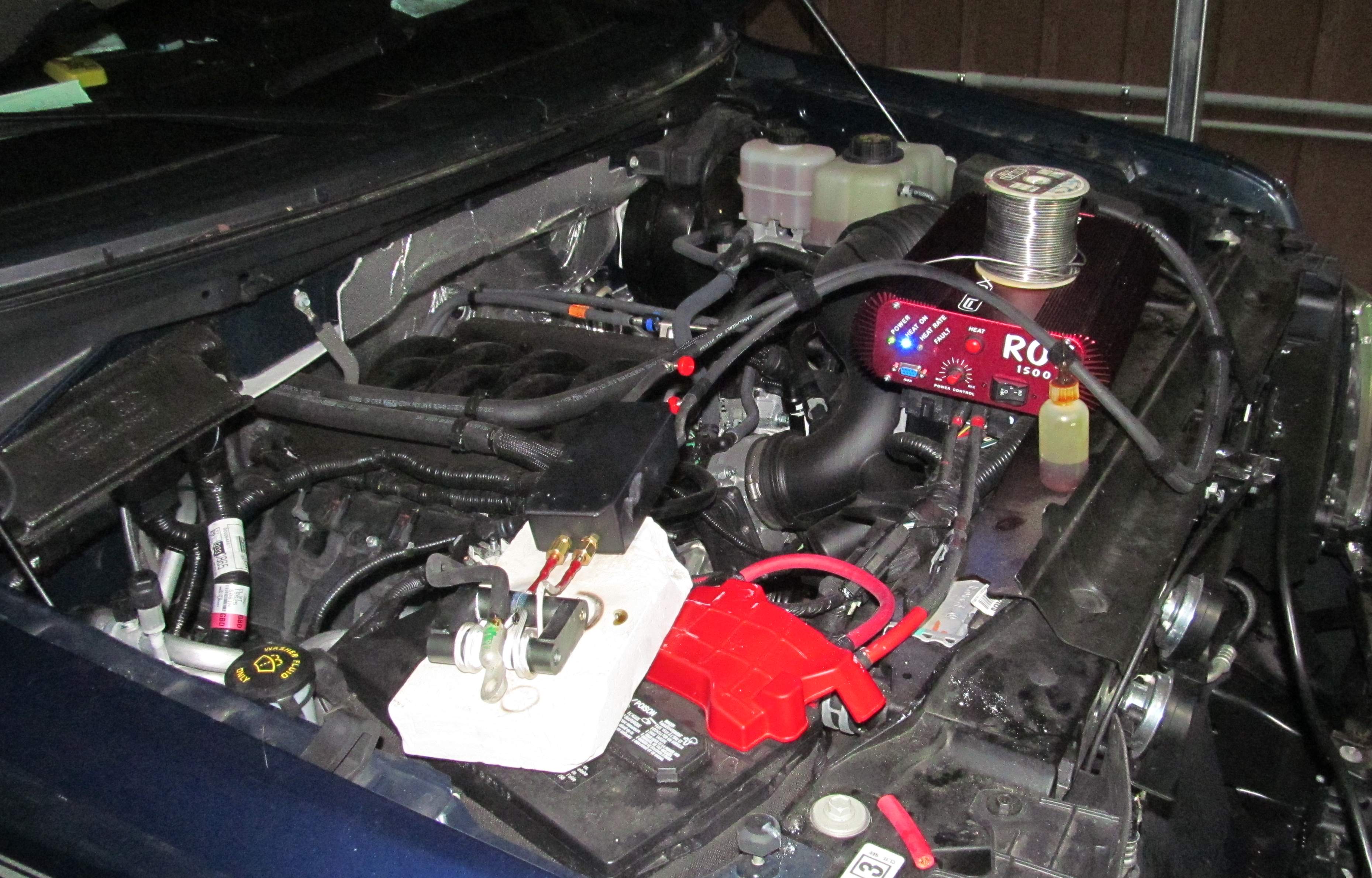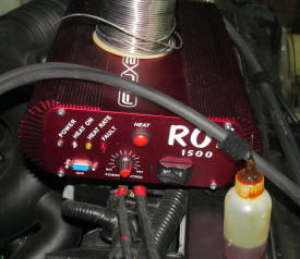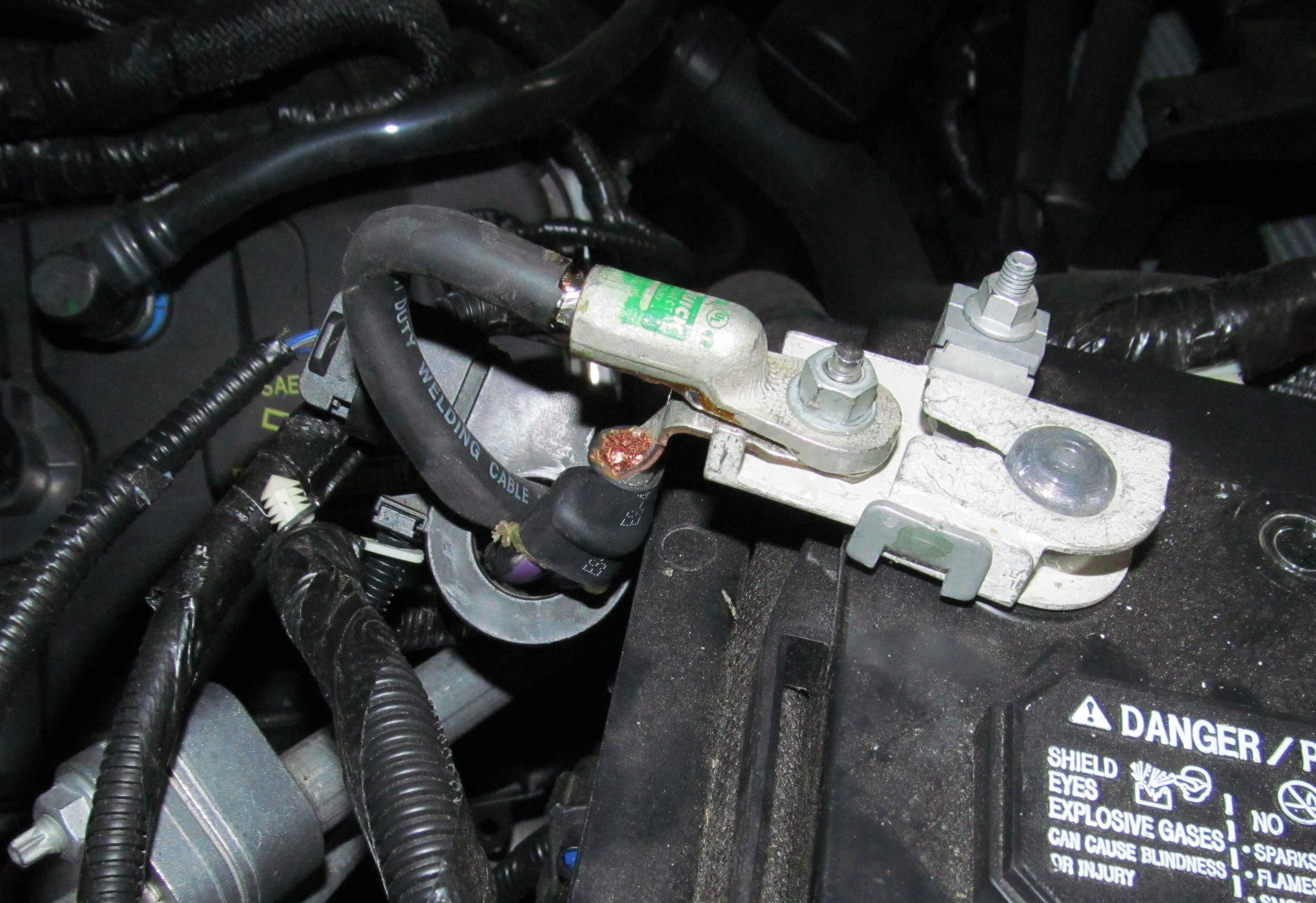 Here we are set up with the Roy induction heater getting ready to solder the negative terminal. This new Ford truck has a current sensor on the negative lead that measures current into and out of the battery to keep track of its state-of-charge. This new cable must pass through that sensor. The cable will fit but the lug won't so the lug has to be soldered after the cable is threaded through the sensor. | ||||||||||||