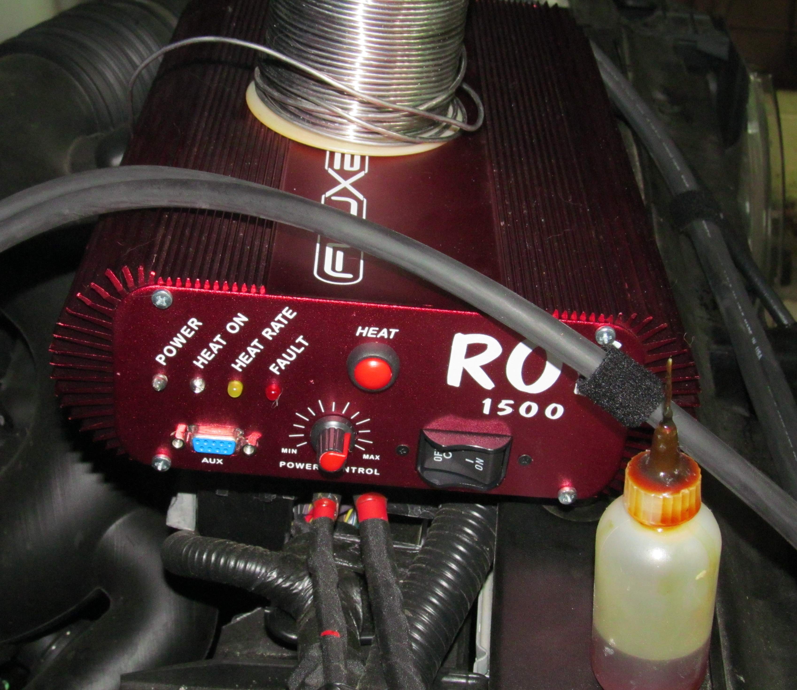 This photo shows everything needed to do a great soldering job. A roll of heavy gauge rosin core solder, some liquid rosin flux and the Roy. | ||||||||||||