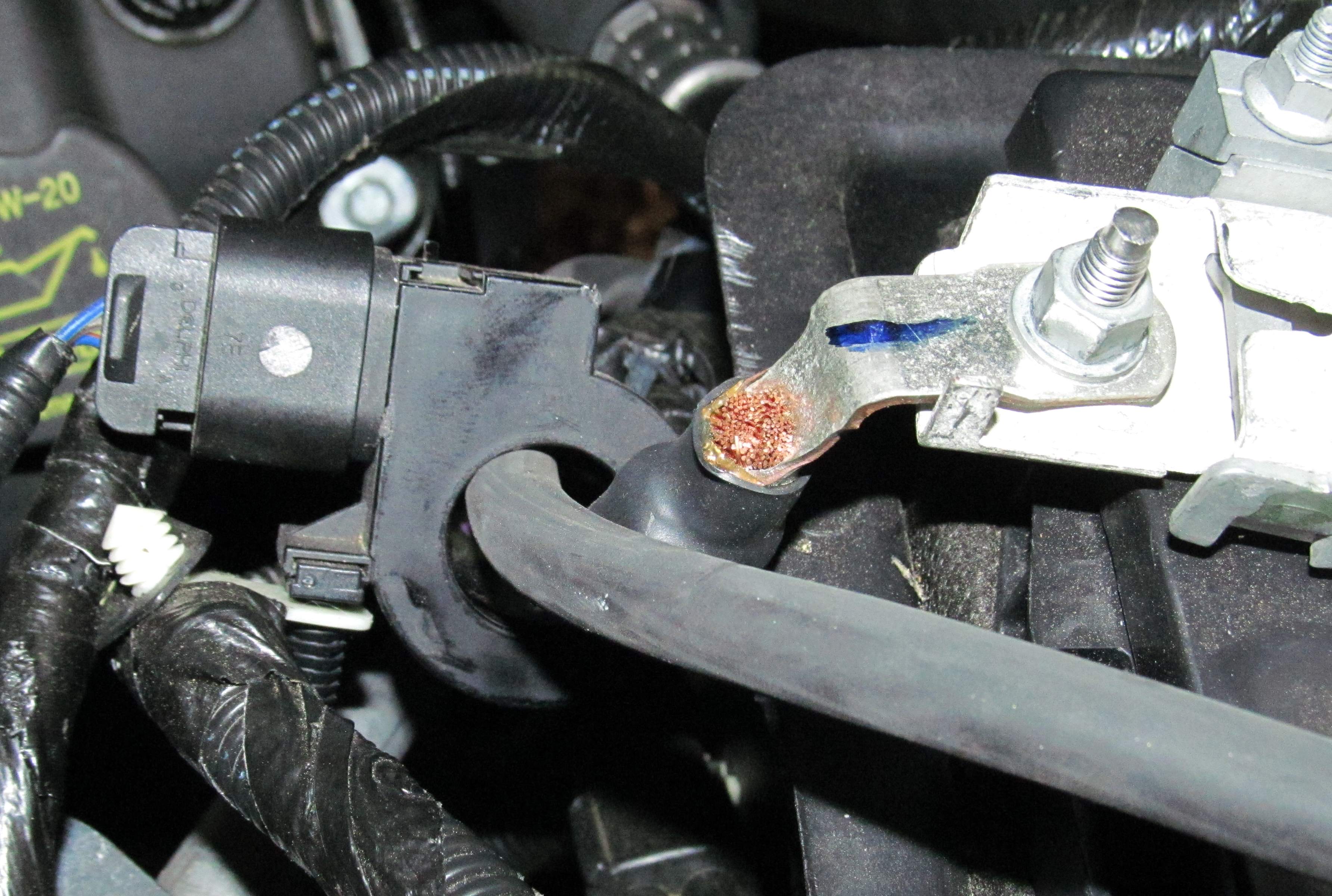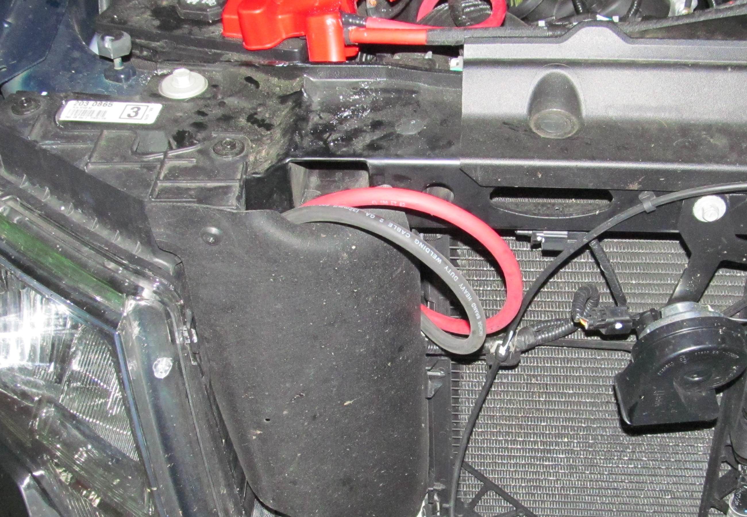 This shows both cables properly attached to the battery. The red cable lug is just barely visible to the right of the cluster of cables. It is taped up with black electrical tape to reduce the possibility of shorts. | ||||||||||||