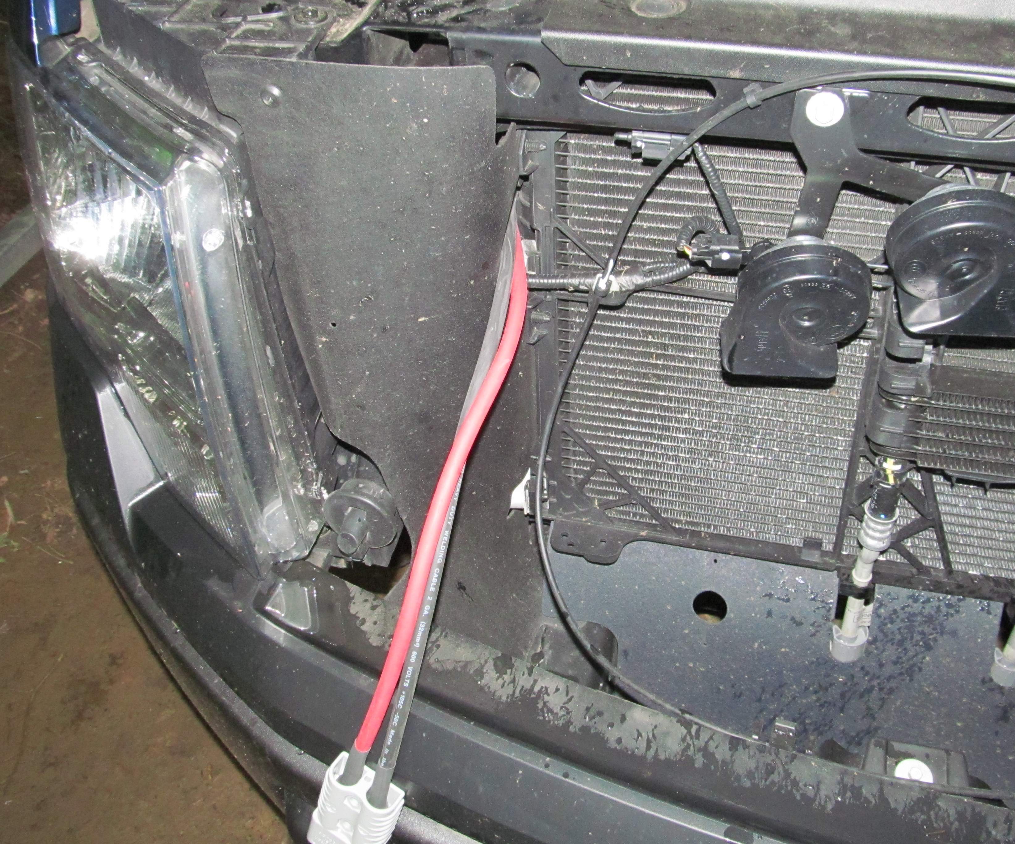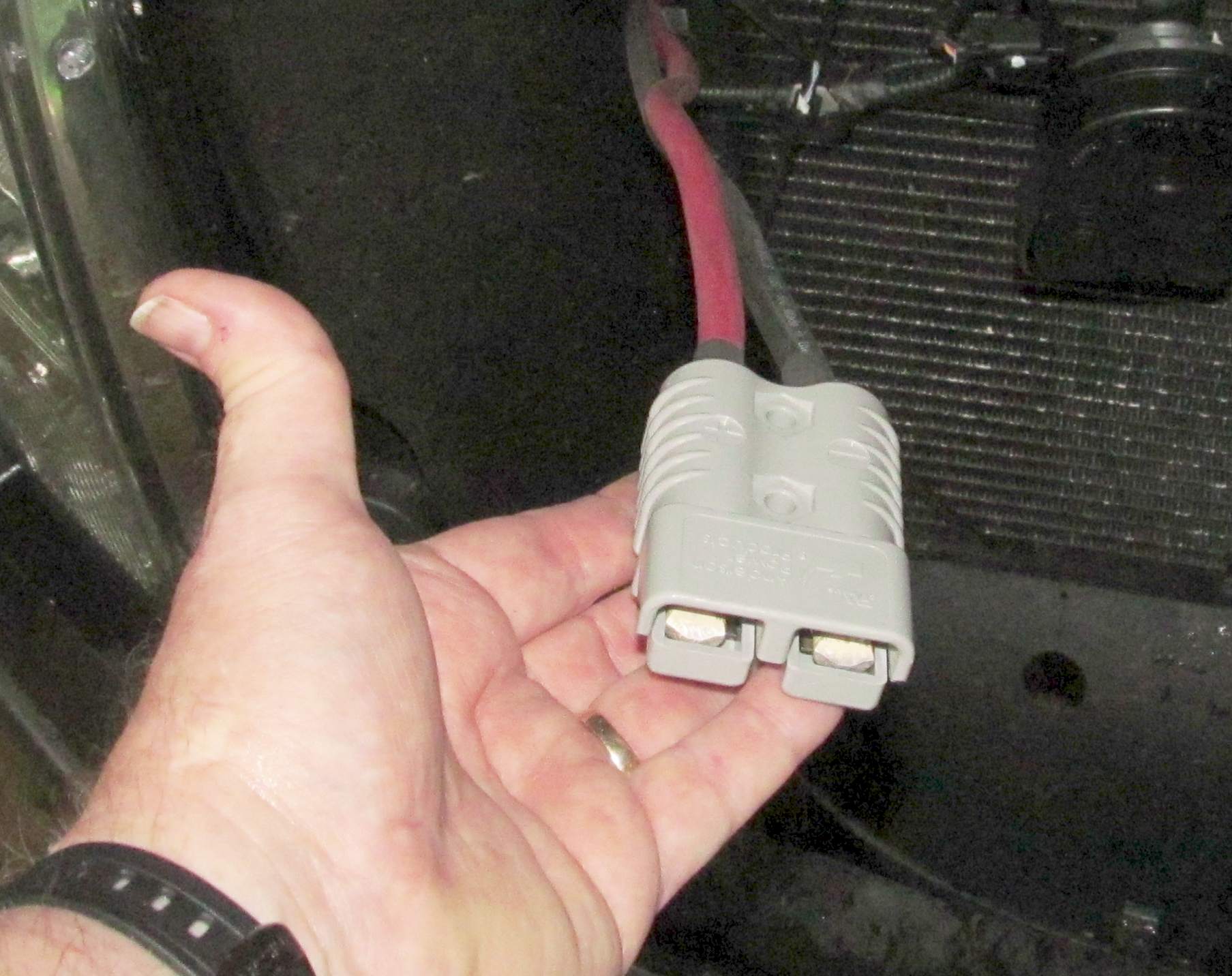A close-up of the Anderson connector. When the connector covers arrive, the cable will be allowed to hang down so that it can be reached without opening the hood. The covers protect the connector from road grime and stuff. I forgot to order them, also available from Cloud Electric. | ||||||||||||