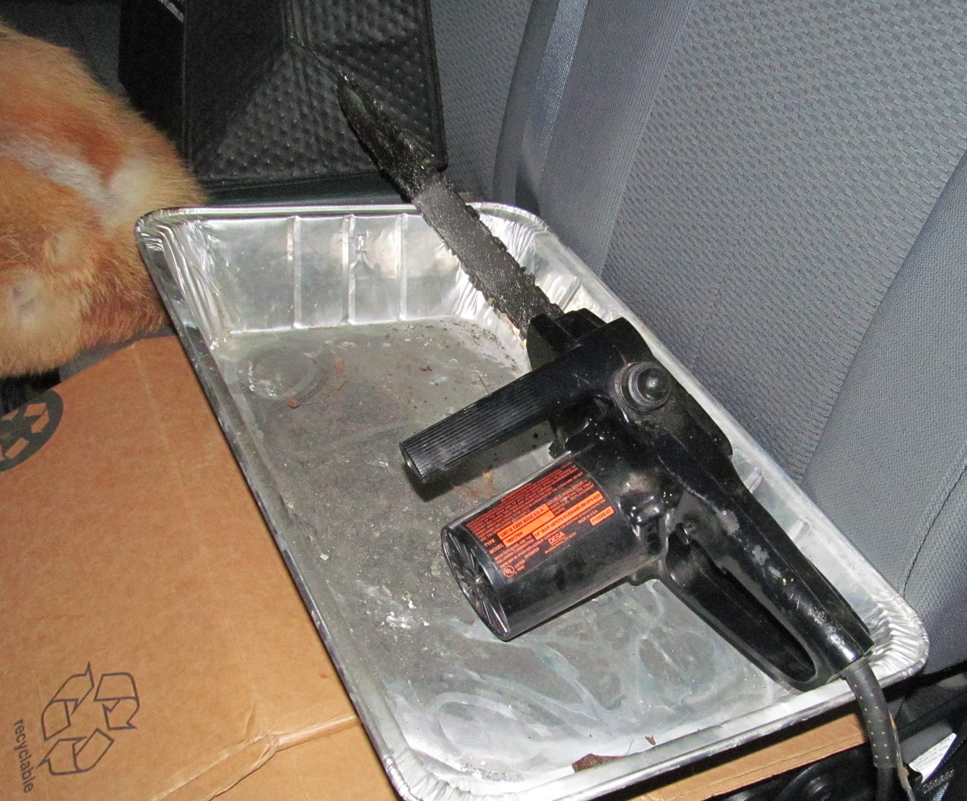 chainsaw. The steam table tray is a handy way to transport the saw and keep grease and oil off the upholstery. As soon as I get a truck bed toolbox, the saw and inverter will go back there but for now it just sits in the back seat. |