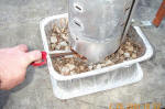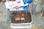 | When the charcoal is burning nicely in the chimney, dump it out on the dirt and place the grill directly over the fire. The briquettes will probably touch the grill. This is fine. |