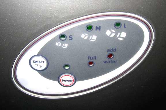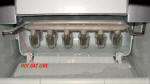 I decided to give one of these a try so I looked around on the net and found a good price at this site - www.qualitymatters.com. If that link doesn't take you directly to the ice maker, click here. I recommend this site with some hesitation. The price was good and delivery quick but the site lied by promising anonymous ordering without having to set up an account. That is important to me, as I don't like leaving bits of personal financial information drifting around the net. To their credit, they did reply to my email and certify that all identifying info had been deleted from their database. I shouldn't have had to ask. The package was shipped on a Monday and arrived in a large box on the next Thursday. The actual ice machine box was packaged inside a larger box with foam sheeting in between. Very nice packaging. Anyway, the specs are roughly thus: I sat the machine on the counter in my apartment, filled it with a gallon of tap water, connected it through a Kill-A-Watt and turned it on while timing it with a stop-watch. The Initial power draw was 220 watts, 313 VA for a power factor of 0.69. As the ice began to form on the cold fingers, the power consumption dropped to 153 watts right before the end of the cycle. This is with the condenser fan off. When activated by the controller, the fan adds about 25 watts. The maximum power draw of 265 watts occurs at the very beginning of the defrost cycle when the fan, the compressor and the flipper motor are all running. With the "size" control set to "medium", the first set of "cubes" started ejecting at 13 minutes, 9 seconds and was complete by 13 minutes, 50 seconds. As the water in the reservoir became chilled, the cycle time shortened to less than 8 minutes. An ice making cycle starts when an internal pump fills the water tray. Projecting into this tray are 12 "cold fingers", polished tubes that are part of the refrigeration system and get very cold. Ice forms on the fingers in a gradually thickening layer. After a set time, depending on the "size" setting, the water tray drops down, dumping the remaining water back to the water reservoir. A refrigerant valve opens, admitting hot refrigerant directly from the compressor into the cold fingers. (This is exactly the same process used to defrost a heat pump evaporator in the wintertime when it freezes up.) They practically instantly thaw, allowing the cubes to drop by gravity. After another set time, the water tray again moves up under the cold fingers. In the process a flipper attached to the tray flips the newly formed cubes into the storage bin. The internal pump fills the water tray and the cycle repeats. When the ice builds up until it contacts the "full" thermal sensor, the unit is shut down and the "full" LED on the control panel illuminated. As the ice melts, the water returns to the reservoir to be re-used. When the ice melts down or ice is removed for use, the "full" sensor warms up and ice making starts again. Following are some photos to demonstrate how the maker works |