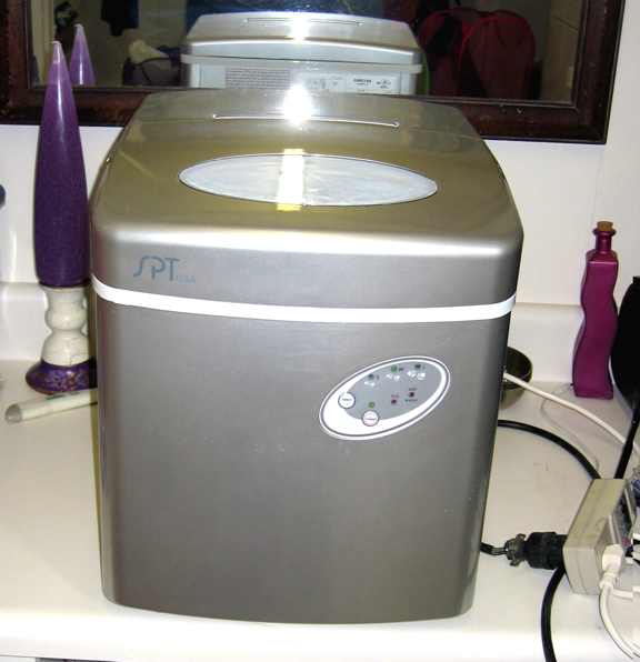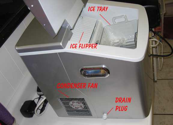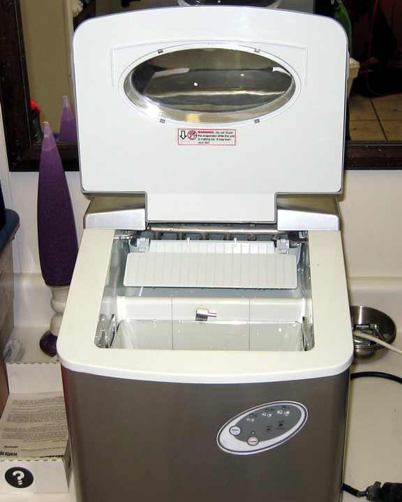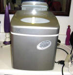 to empty the bin and replenish the water every couple of hours. While I'm quite satisfied with this machine, I have some concerns about sanitation. Ice melt reenters the water reservoir to be reused in making new cubes. This is fine as long as the lid is kept shut and no one paws the cubes with dirty hands. Unfortunately that cannot be guaranteed, especially when many people are using the machine, such as at a party. Especially if the libations are flowing freely. Probably the best way to address this problem is to not have the machine accessible to guests and instead empty the basket into an ice bucket. Even with reasonable precautions against contamination, I would want to sanitize the system every couple of days. The manual doesn't do a very good job of addressing this, vaguely suggesting washing the reservoir with mild soap every so often. I'm going to sanitize mine following standard restaurant procedures of filling the reservoir with a 100ppm chlorine bleach solution and running a cycle. This will circulate the sanitizing solution throughout the water system. Follow with a clean water flush and drain before filling with water to start ice making again. I have some thoughts about mounting a small shortwave UV germicidal lamp in the water reservoir to continuously sanitize the water. More on that later. I tested this unit on a 400 watt inverter and it started and ran just fine. I would expect it to work on a 300-350 watt inverter, though it is getting hard to find one that small these days. One other thought. I see no reason why a non-corrosive beverage could not be used instead of water to make "beverage cubes". Iced tea, coke, etc. Alcoholic solutions probably wouldn't work well because the water would tend to crystallize out of the solution, leaving the alcohol. I'm going to try some "iced tea cubes" and see how it works. |