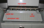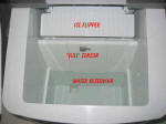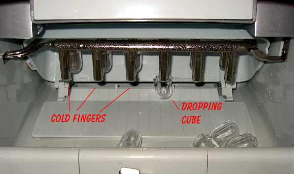 ![]() Here we see the cubes dropping from the cold fingers. The white flipper attached to the water tray will flip the cubes over the lip and into the storage bin as the water tray returns to position. |
