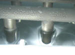 ![]() This shows the beginning of the harvest or dump cycle. The water tray has dropped away, dumping the remaining water back to the sump. The hog gas valve has been opened. Note that the hot gas line on the left has already thawed. In another couple seconds the whole assembly will be warm enough that the cubes fall away by gravity. |