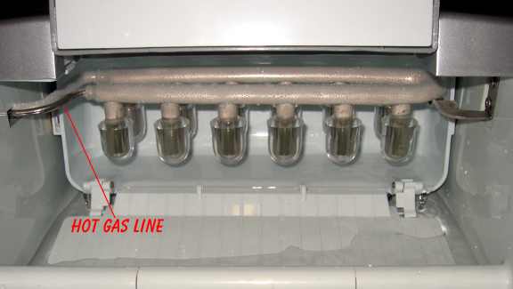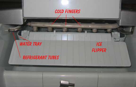 ![]() Here several parts of the ice making apparatus are identified. Note the refrigerant tubes on the left and the curved bracket on the right. I had to slightly bend these parts to fully immerse the cold fingers in the water |