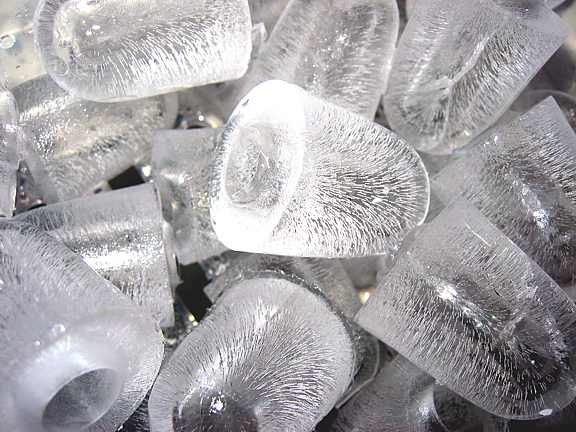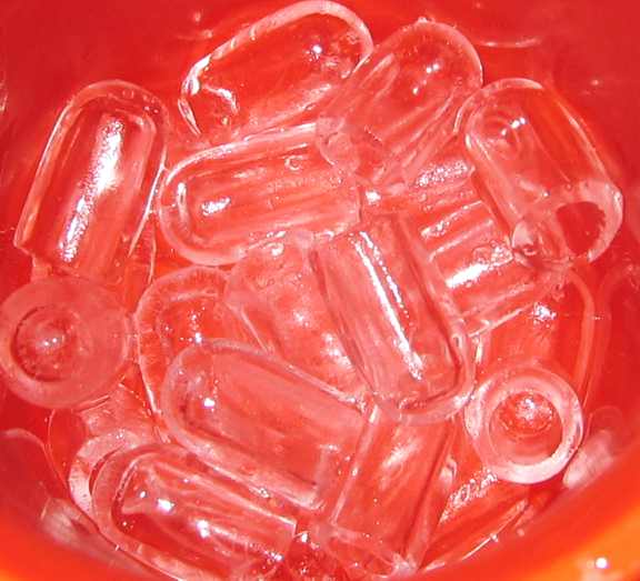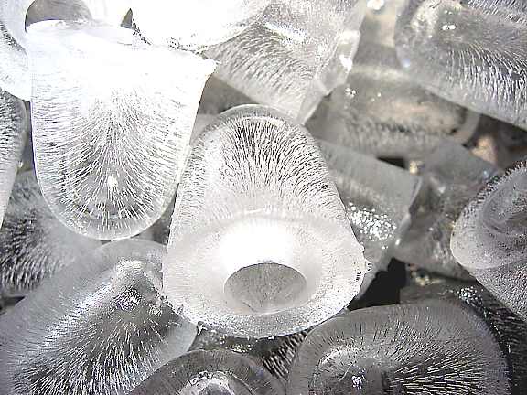 ![]() This is a photo of ice made with fresh distilled water. They're orange because I put the first batch in my big orange tea cup before thinking to grab the camera :-) Notice the total lack of air bubbles and the complete clarity. |
